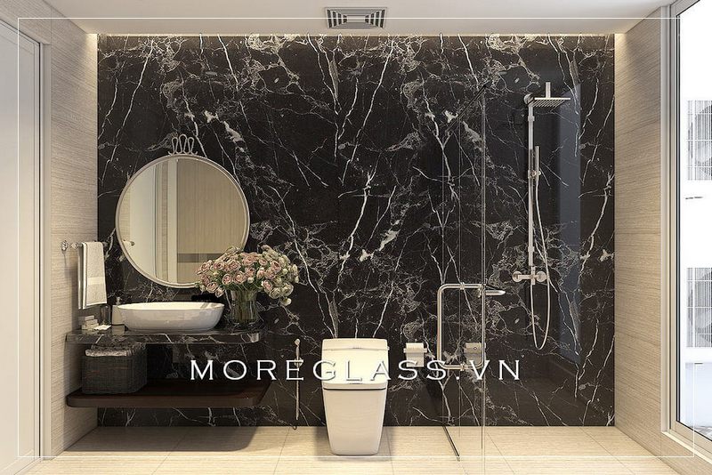 Mẫu thiết kế nội thất phòng tắm nhỏ, hiện đại, nổi bật với bức tường đá màu đèn vân mây sang trọng, đẳng cấp