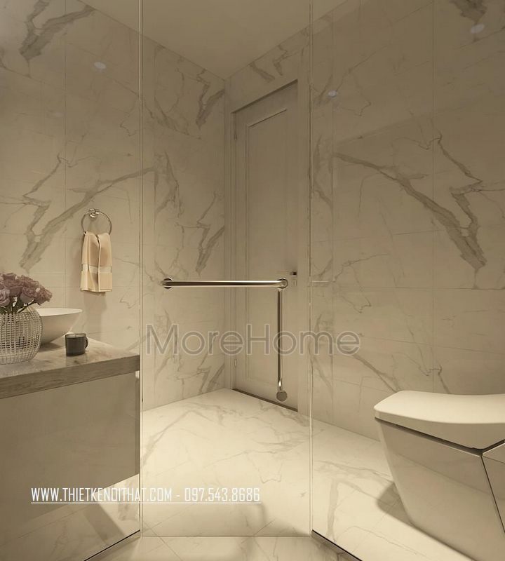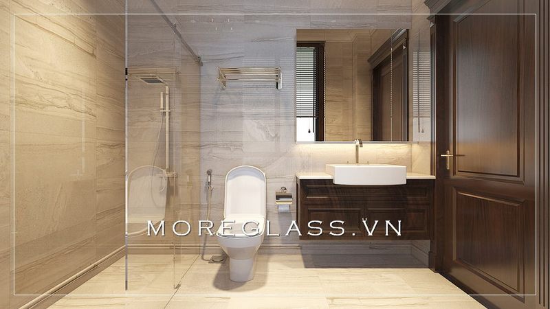 Đứng từ góc độ phòng tắm kính nhìn ra bạn có thể thấy đây là không gian phòng tắm hiên đại, tối giản về nội thất đem đến sự thông thoáng, cuốn hút