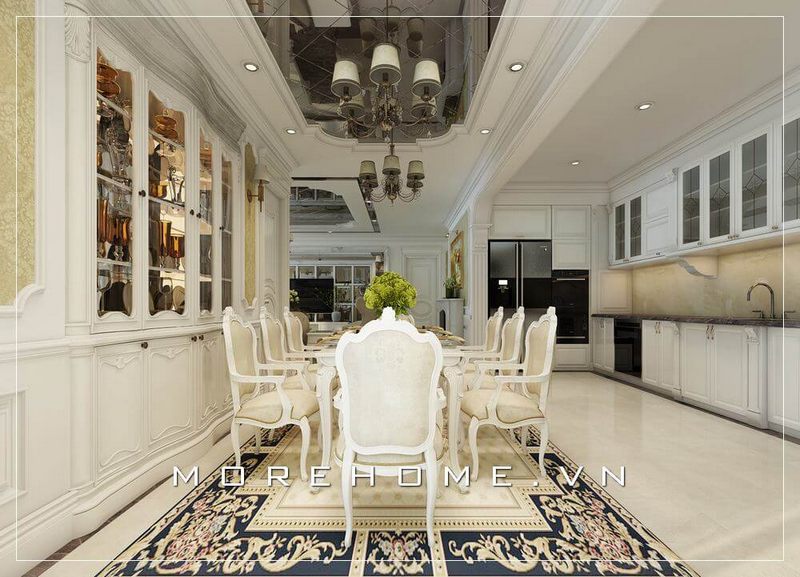 Lựa chọn lối thiết kế tân cổ điển tinh tế, tỉ mỉ, bàn ăn gỗ tự nhiên với những đường cong chạm trổ khéo léo để lại cho bất kì ai nhìn vào một không gian dùng bữa ấm áp mà đẳng cấp hơn cả