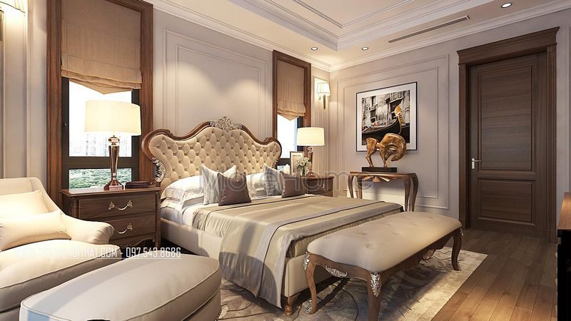 Luôn có nhiều cách thể hiện vẻ đẹp nghệ thuật cho những không gian phòng ngủ biệt thự tân cổ điển. Mẫu thiết kế nội thất phòng ngủ biệt thự này - Giường ngủ tân cổ điển gỗ óc chó này là một minh chứng