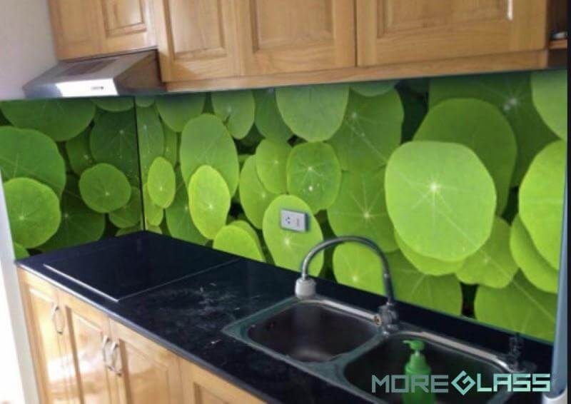 Thiết kế nội thất phòng bếp chung cư, nhà phố phong cách hiện đại, với hệ tủ bếp chữ I bằng gỗ tự nhiên, mặt bàn bếp đá nhân tạo cao cấp kết hợp kính ốp bếp cường lực in tranh 3D