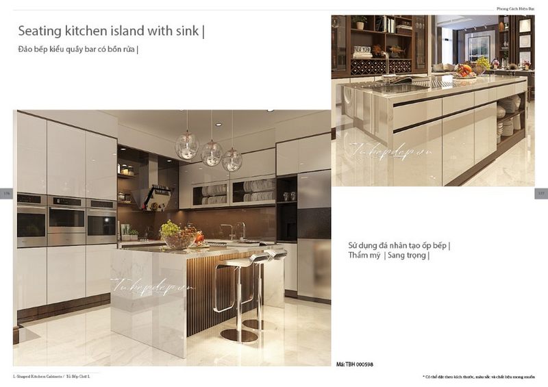 Mẫu thiết kế tủ bếp bằng gỗ công nghiệp chống ẩm ốp mặt đá nhân tạo trắng vân mây cao cấp