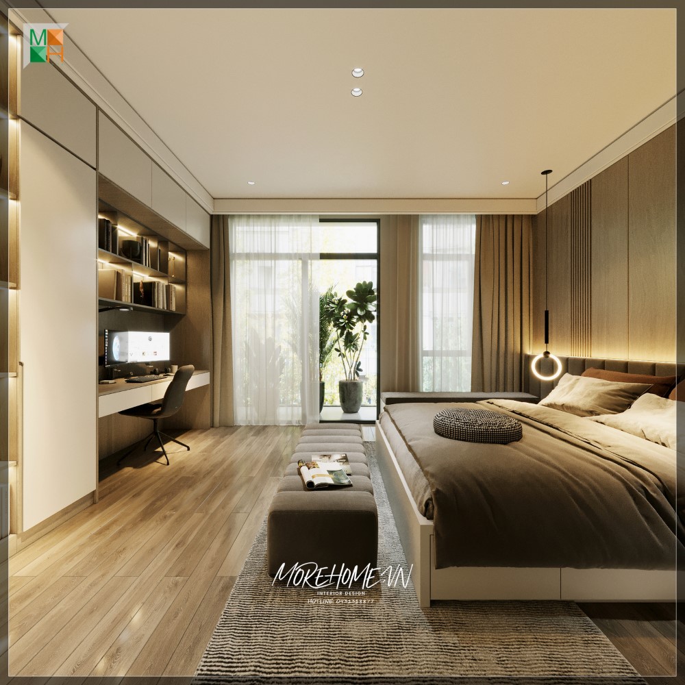 Ghế sofa hình chữ nhật bọc nệm màu xám được đặt ở cuối giường góp phần tạo nên nét đẹp và thẩm mỹ cho không gian.