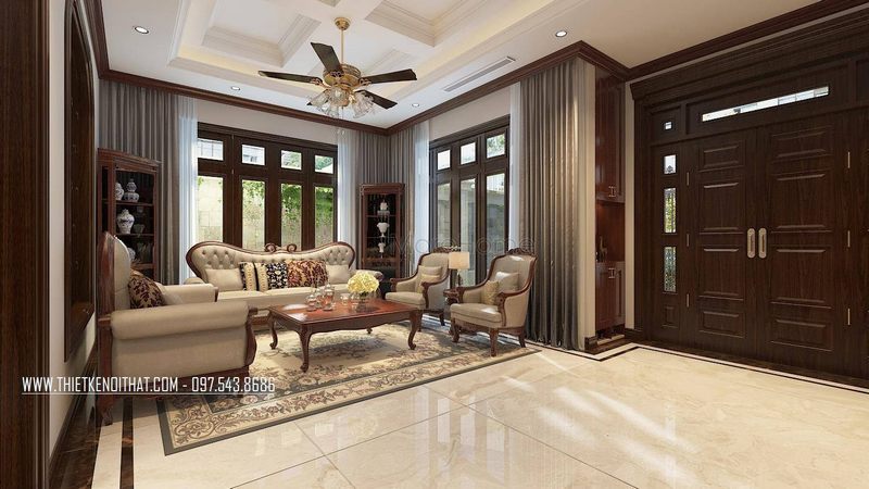 Thiết kế phòng khách theo phong cách tân cổ điển với nội thất gỗ óc chó tự nhiên bọc bởi nỉ Bỉ cao cấp.
